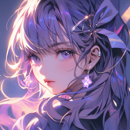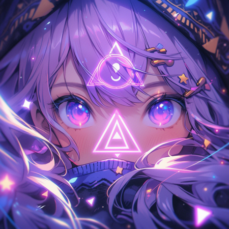 一个动漫女孩,紫色头发,霓虹紫色,周围是眼睛,魔法圆圈,逼真的幻想风格,淡紫丁香和浅薰衣草,32k 超高清,彩色绘画,电影