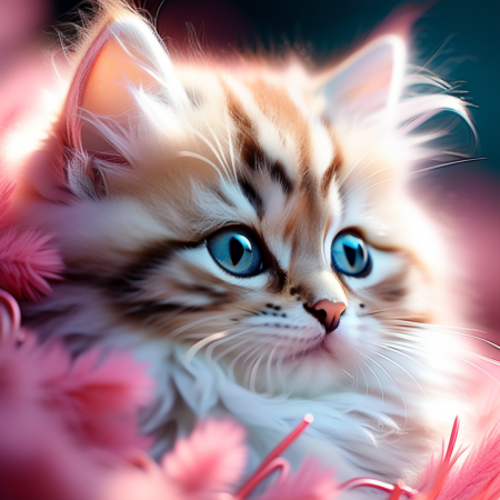 小猫咪。柔软的毛发,明亮的眼神。温柔,可爱。淡蓝色背景。蜷缩着身体。慵懒的姿态。清新,自然。粉嫩的小鼻子。灵动的胡须。平静,美好。