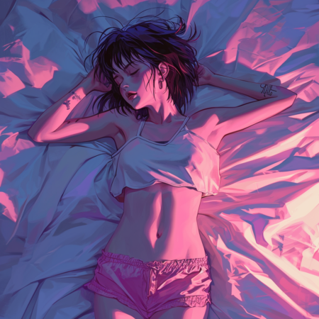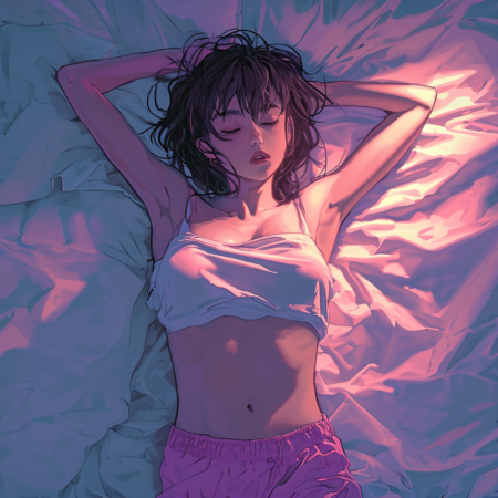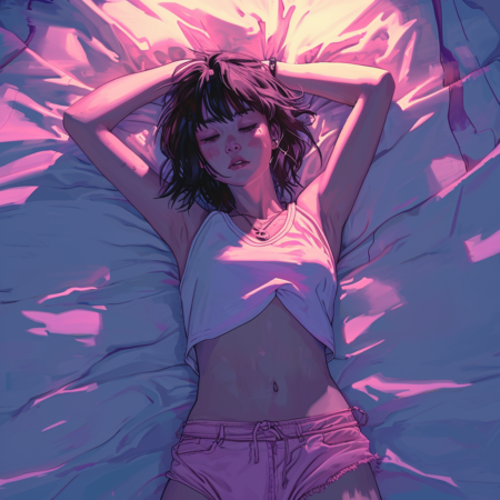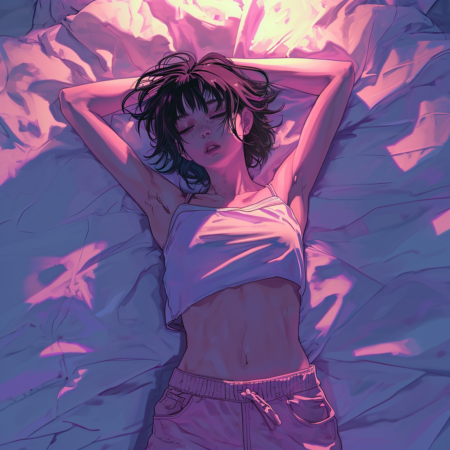 Anime character lying in bed and looking at the ceiling, woman, 32K UHD, 1990s, majestic pose, top view, full body, pink shortpants --v 6