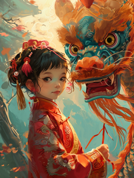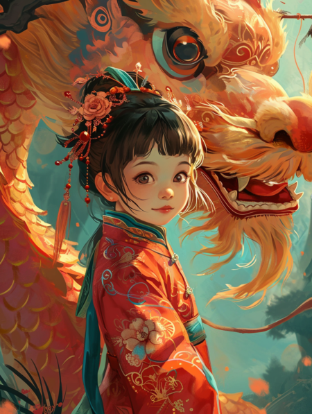 Chinese new year Festival, dragon year, cute girl with big dragon, cute style --ar 3:4 --v 6