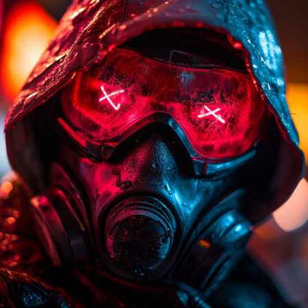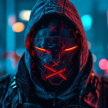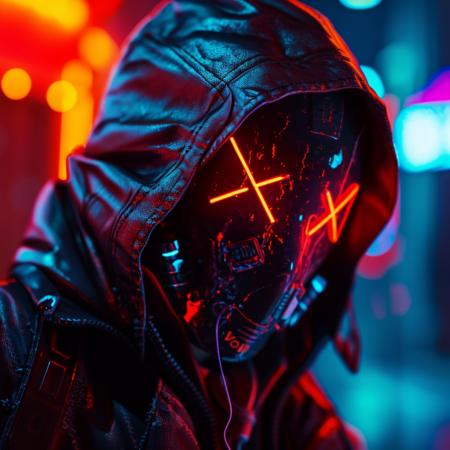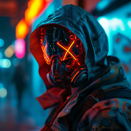 photorealistic cyberpunk assassin wearing a neon glowing mask with an "X" on its mask, digital age, futuristic, avant garde --v 6
