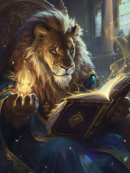 a lion wizard, reading a magic book, in a magical place --ar 3:4 --v 6