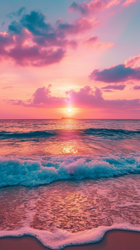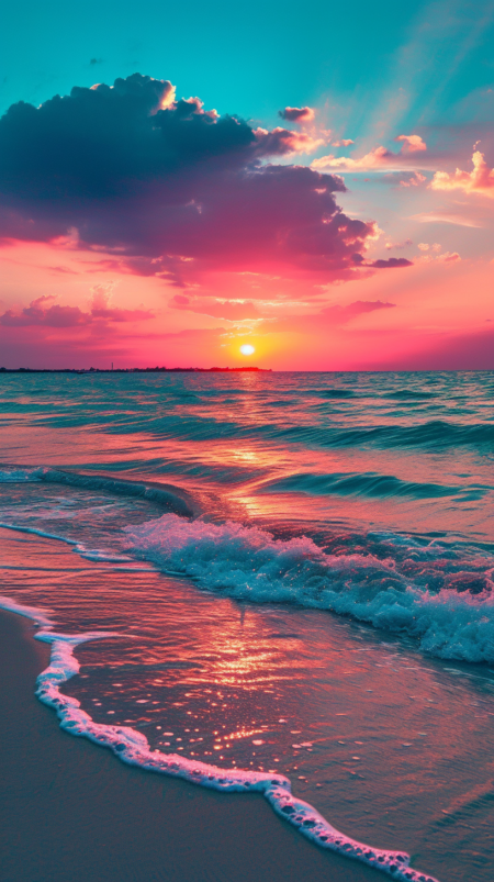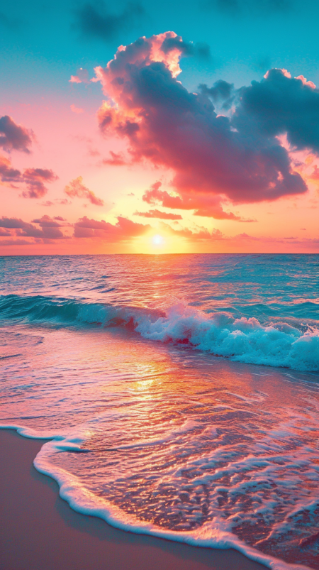 beautiful sunset over a sandy beach and ocean, in the style of light teal and light magenta, spectacular backdrops --ar 9:16 --style raw --stylize 250 --v 6