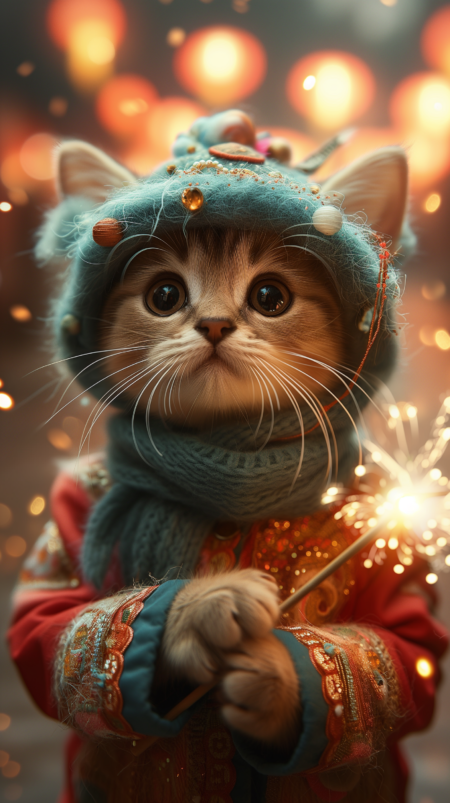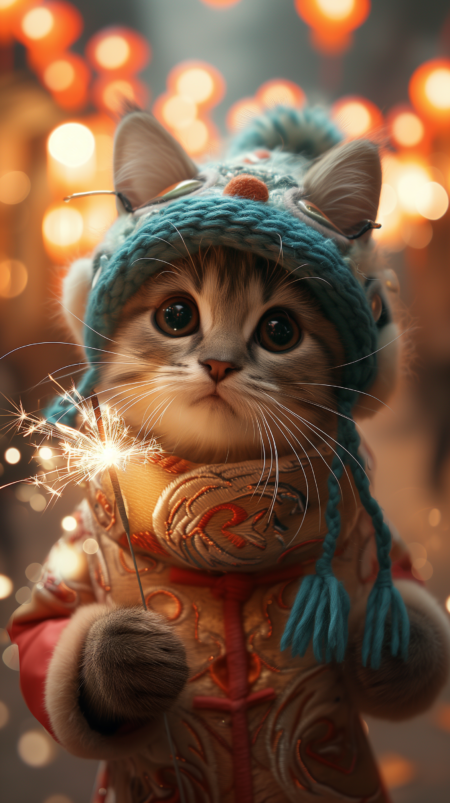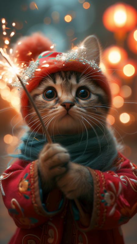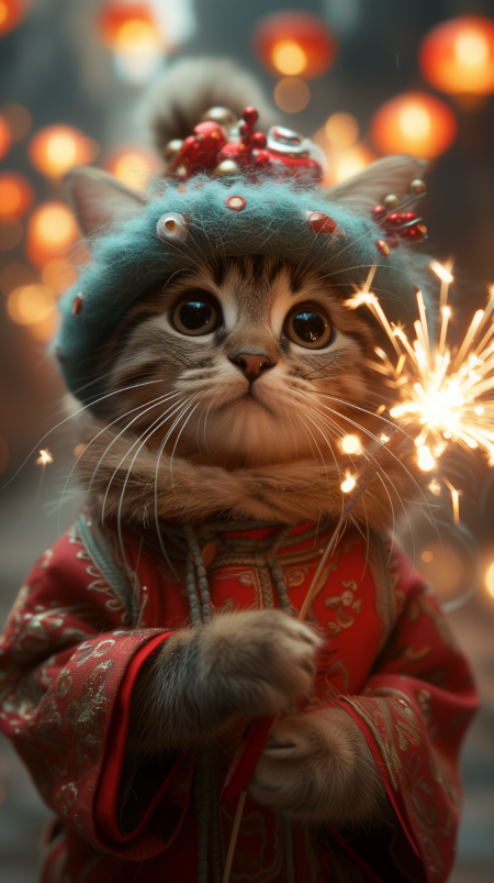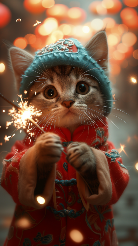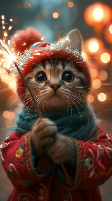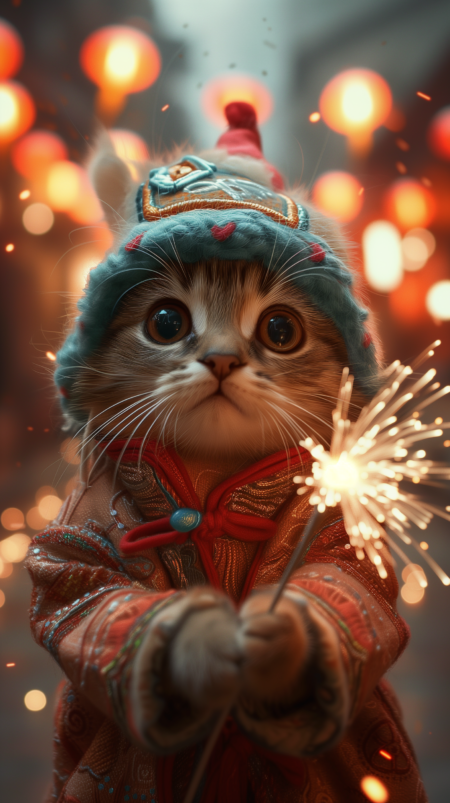 https://s.mj.run/jGEslQTnhG8 A cute little cat wearing a traditional Chinese dragon dance hat and fashionable Chinese clothing, holding a lit fairy stick surrounded by fireworks, creating a whimsical festive atmosphere. The background is a street in Guangdong at night with lanterns --ar 9:16 --stylize 750 --v 6
