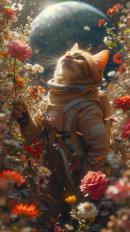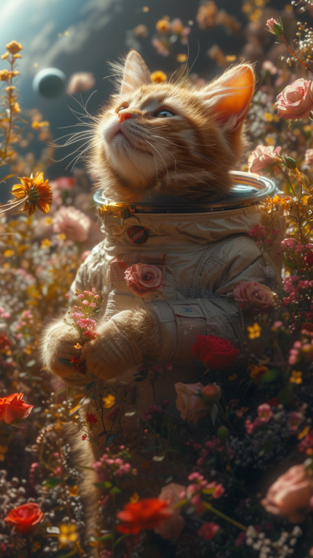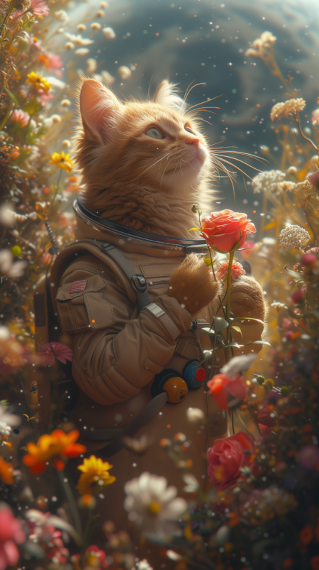 An orange cat wearing a spacesuit stands on the surface of the moon covered in flowers, holding flowers and roses in its hands. The sunlight shines on it, and the background can see the Earth in the distance. Realistic photography, --ar 9:16 --stylize 750 --v 6