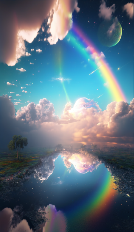 超现实的复杂cg效果图、俯瞰透明多彩的宇宙、彩虹光、柔和光滑的云、光滑的云、光束、Tindal效果、cg3d效果、干净透明的天空、透光超广角、头顶拍摄、向下看、大气、蓝色反射