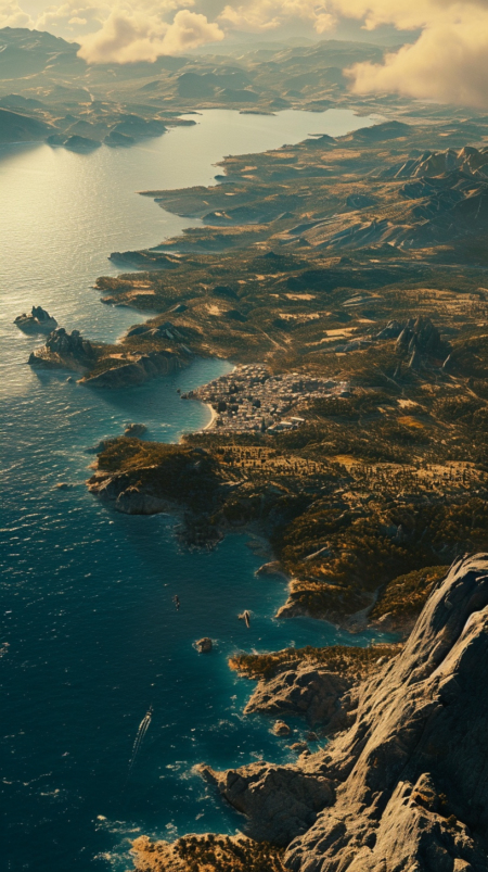海岸鸟瞰图,屡获殊荣的工作室摄影,专业色彩分级,柔和阴影,无对比度,干净锐焦数码摄影